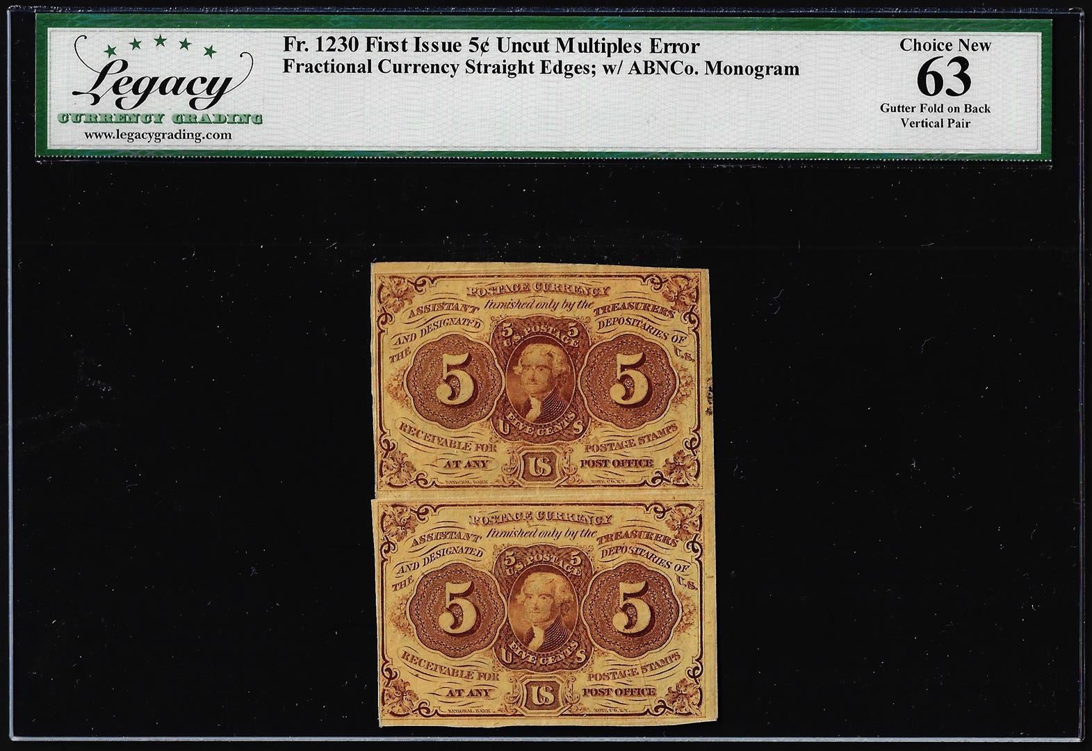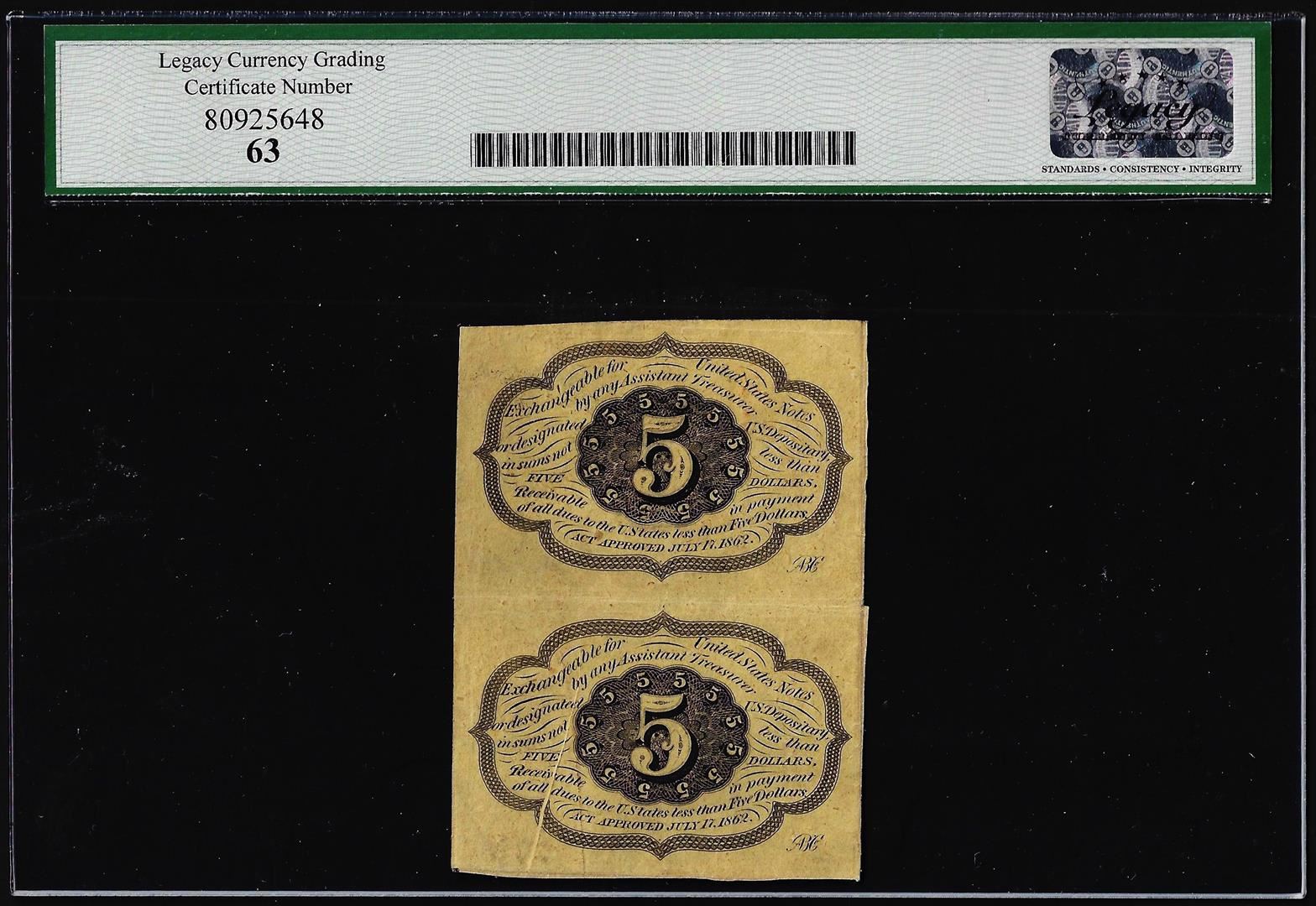One Uncut Sheet of (2) 1862 First Issue 5 Cent Fractional Note Fr.1230 Legacy Choice New 63. Legacy Graded.