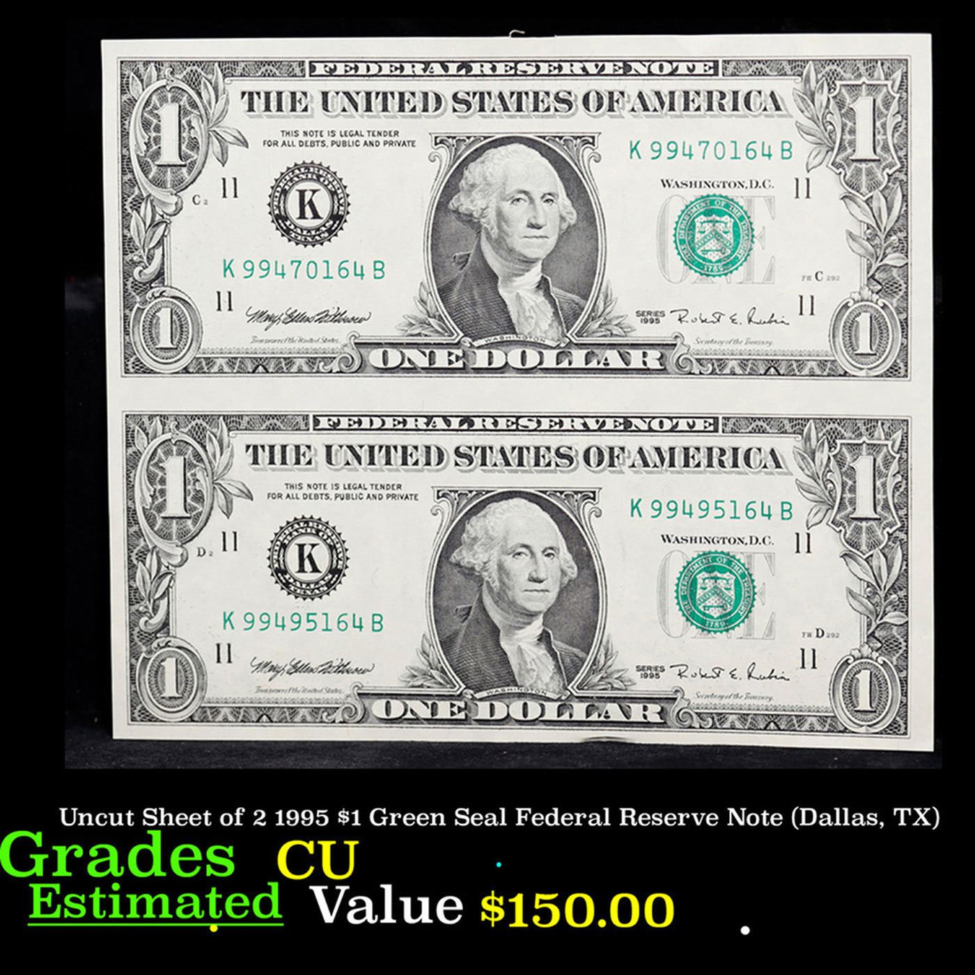 Uncut Sheet of 2 1995 $1 Green Seal Federal Reserve Note (Dallas, TX) Grades CU.