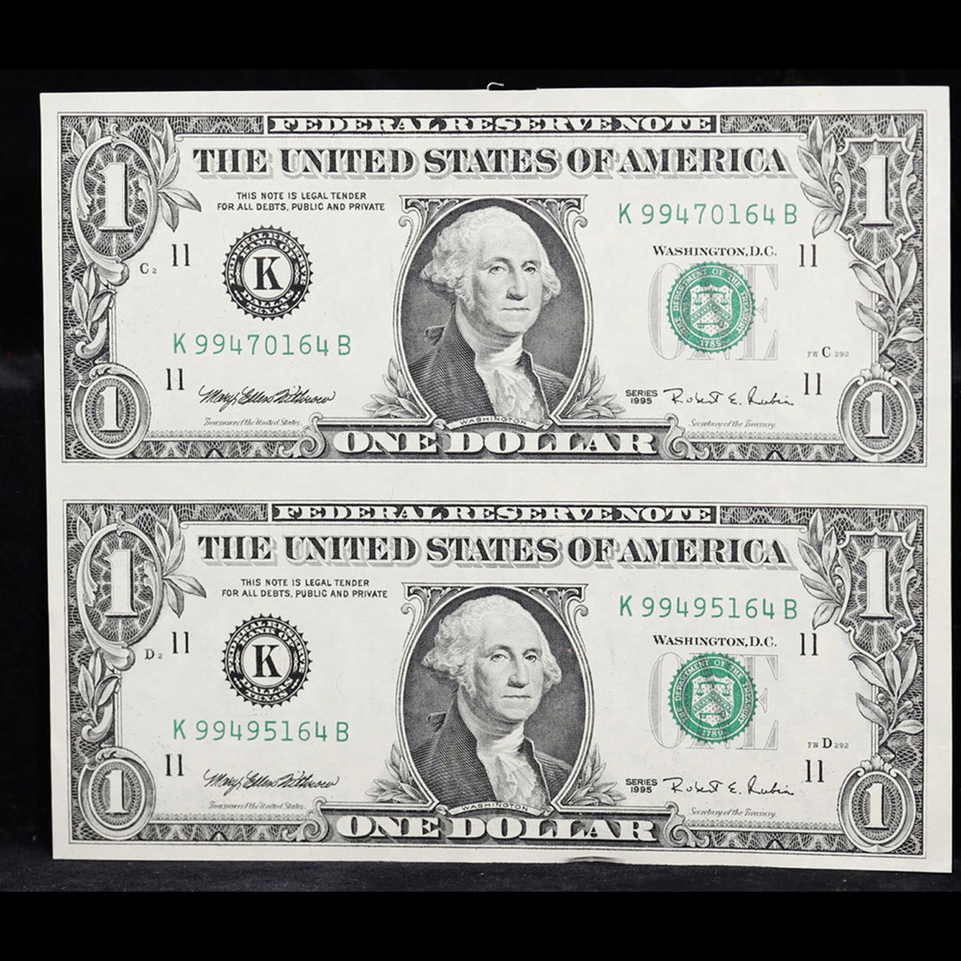 Uncut Sheet of 2 1995 $1 Green Seal Federal Reserve Note (Dallas, TX) Grades CU