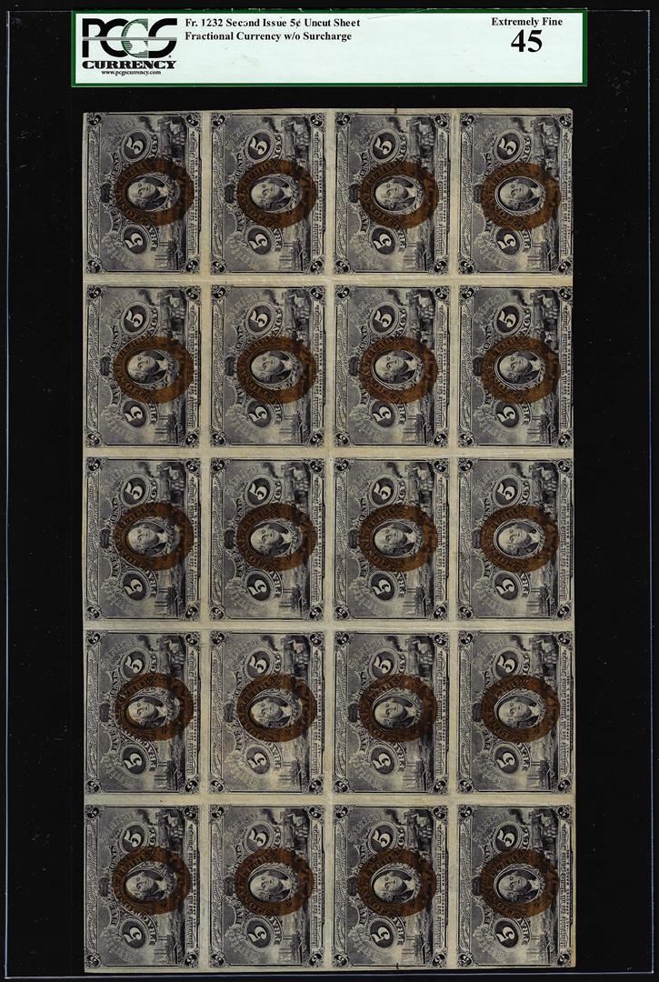 One Uncut Sheet of (20) 1863 Second Issue Five Cent Fractional Notes PCGS Extremely Fine 45. PCGS Graded.