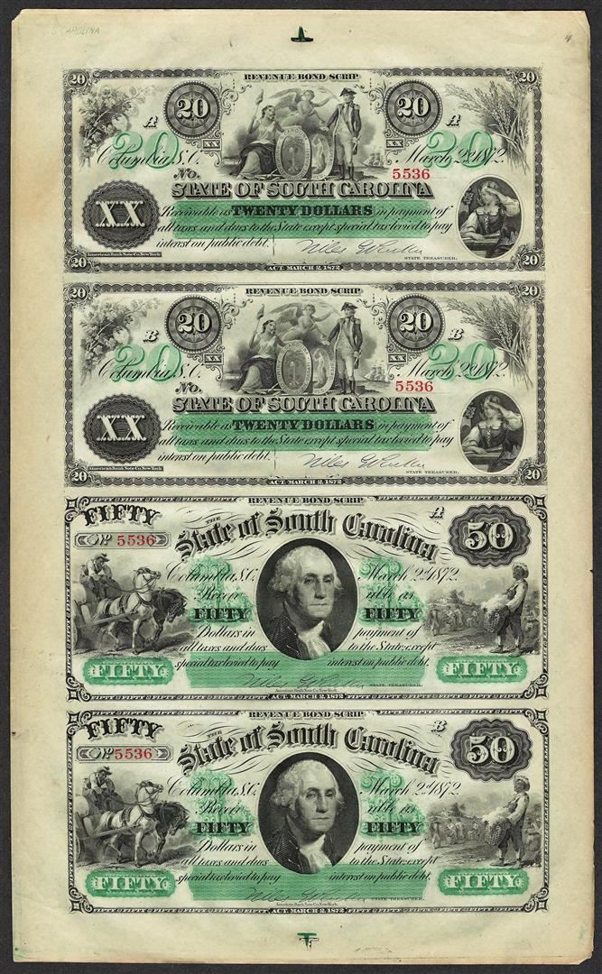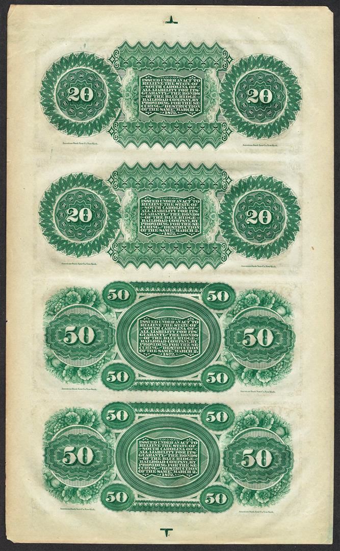 One Uncut Sheet of $20/$20/$50/$50 State of South Carolina Obsolete Notes.