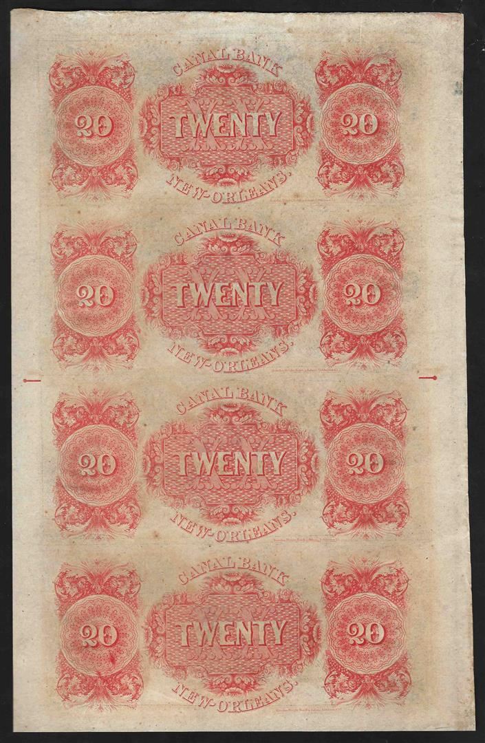 One Uncut Sheet of $20 Canal Bank New Orleans Obsolete Notes.