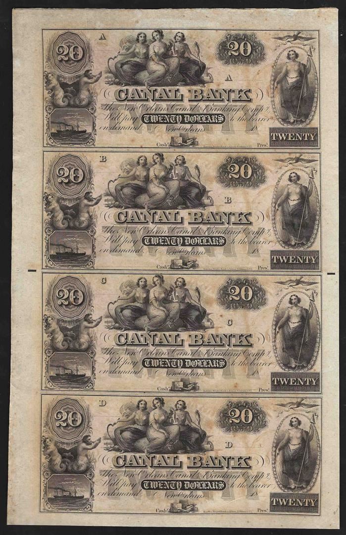 One Uncut Sheet of $20 Canal Bank New Orleans Obsolete Notes.
