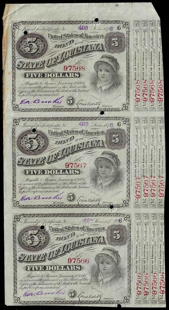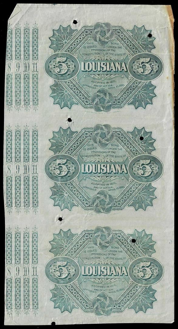 Uncut Sheet of (3) 1876 State of Louisiana Baby Bond Obsolete Notes