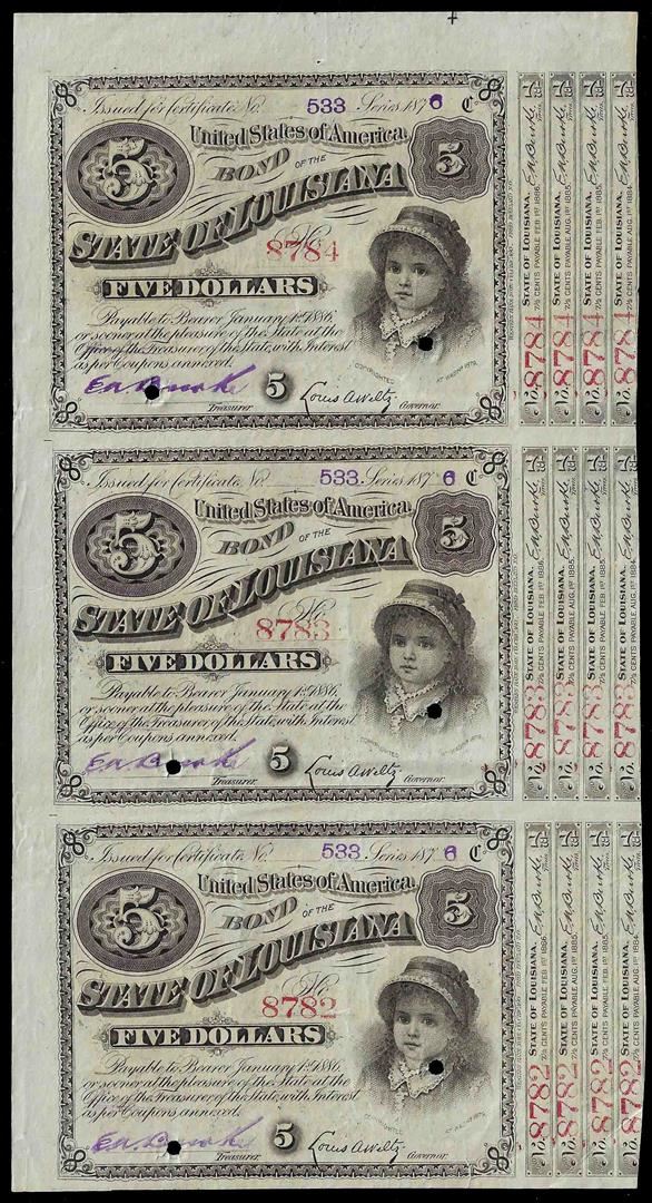 Uncut Sheet of (3) 1876 State of Louisiana Baby Bond Obsolete Notes