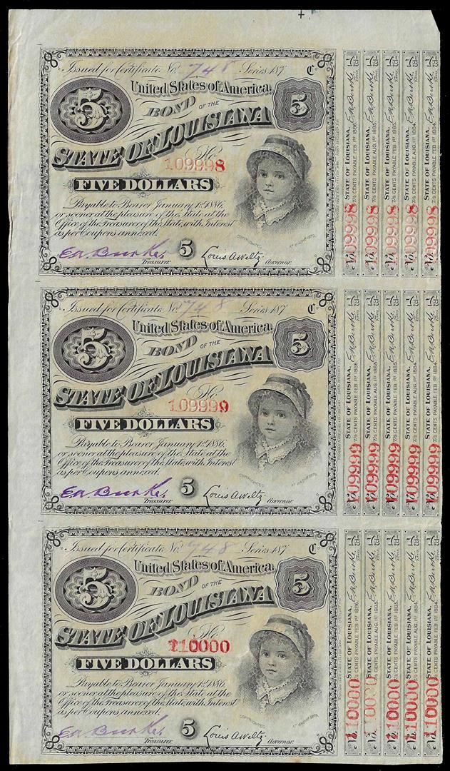 Uncut Sheet of (3) State of Louisiana Baby Bond Obsolete Notes