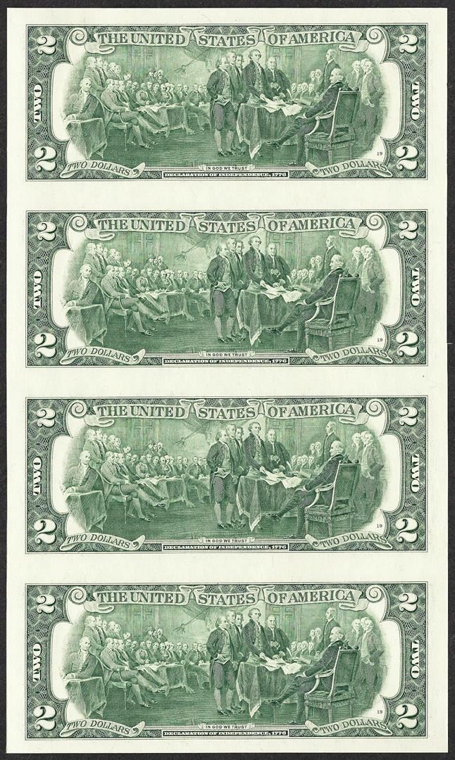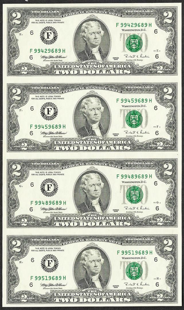 One Uncut Sheet of (4) 1995 $2 Federal Reserve Notes Atlanta.