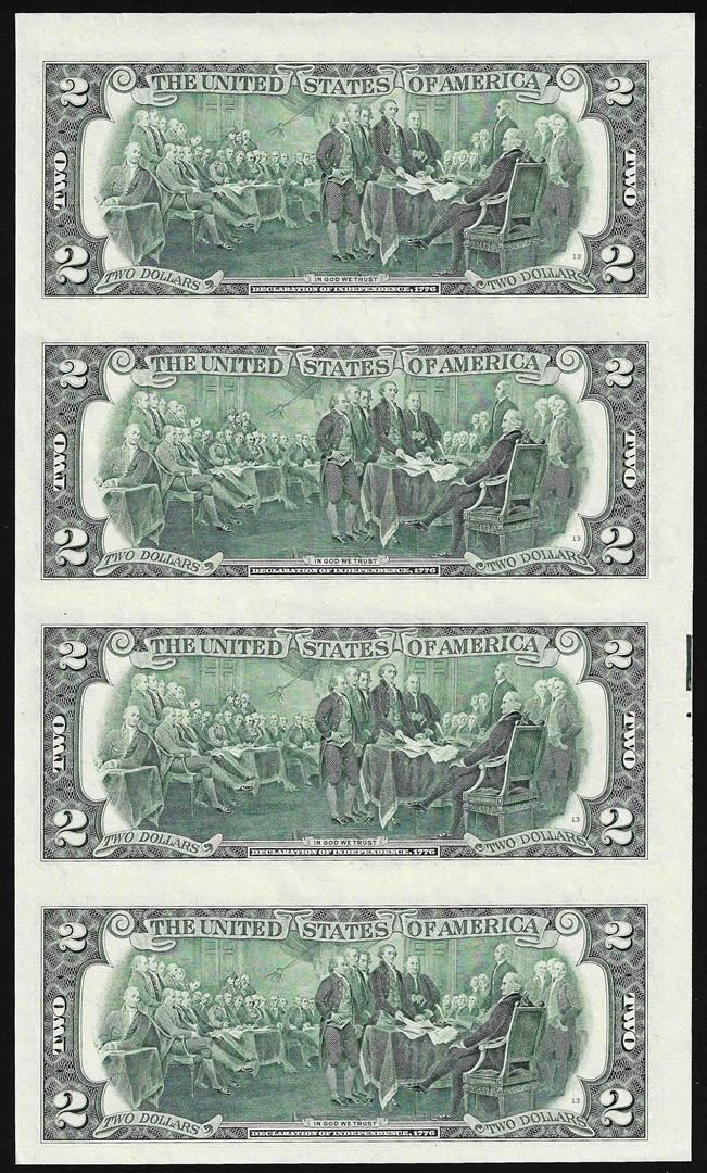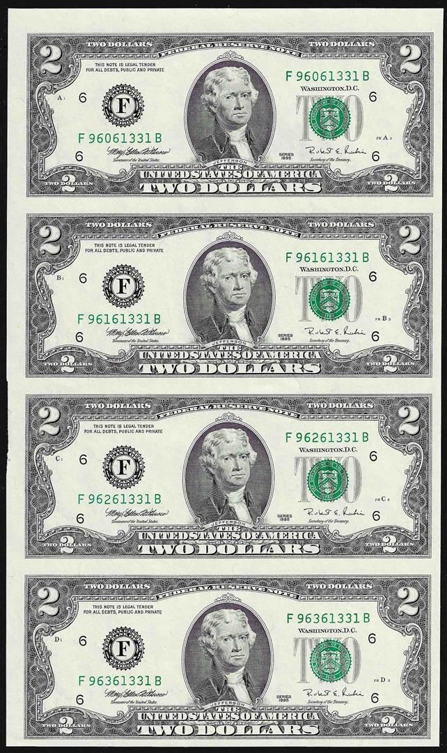 One Uncut Sheet of (4) 1995 $2 Federal Reserve Notes.