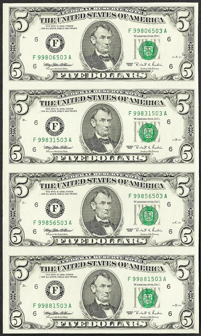 One Uncut Sheet of (4) 1995 $5 Federal Reserve Notes Atlanta.