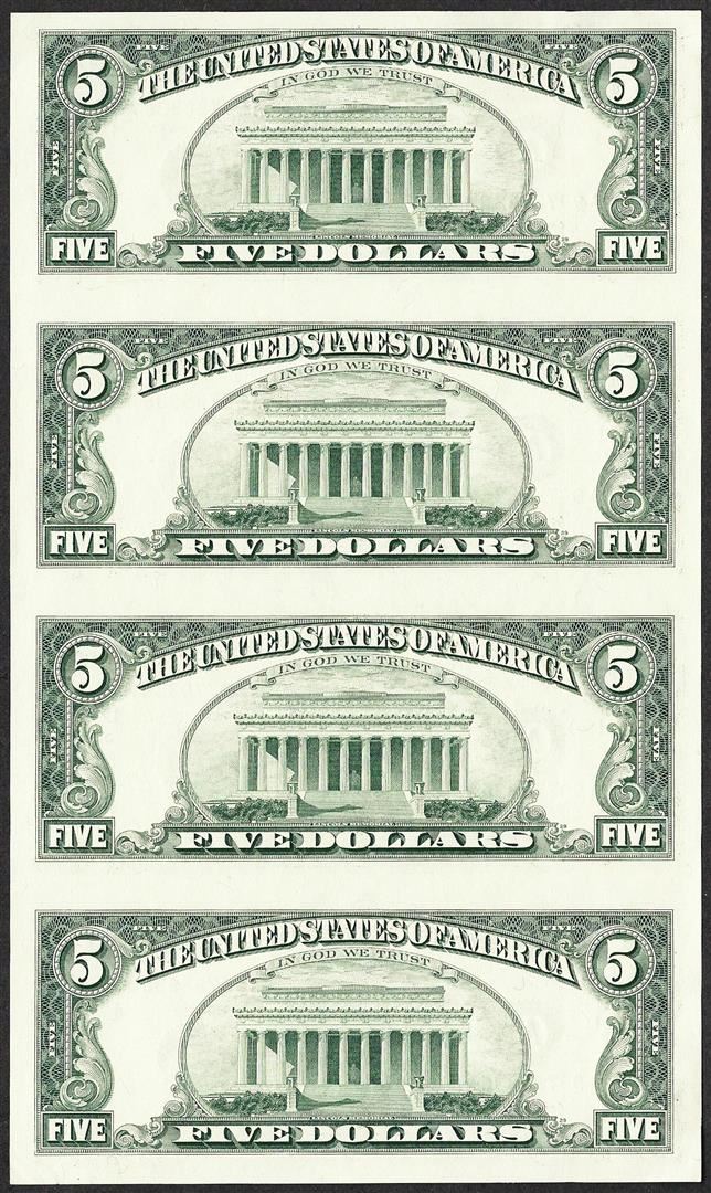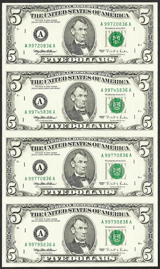 One Uncut Sheet of (4) 1995 $5 Federal Reserve Notes Boston.