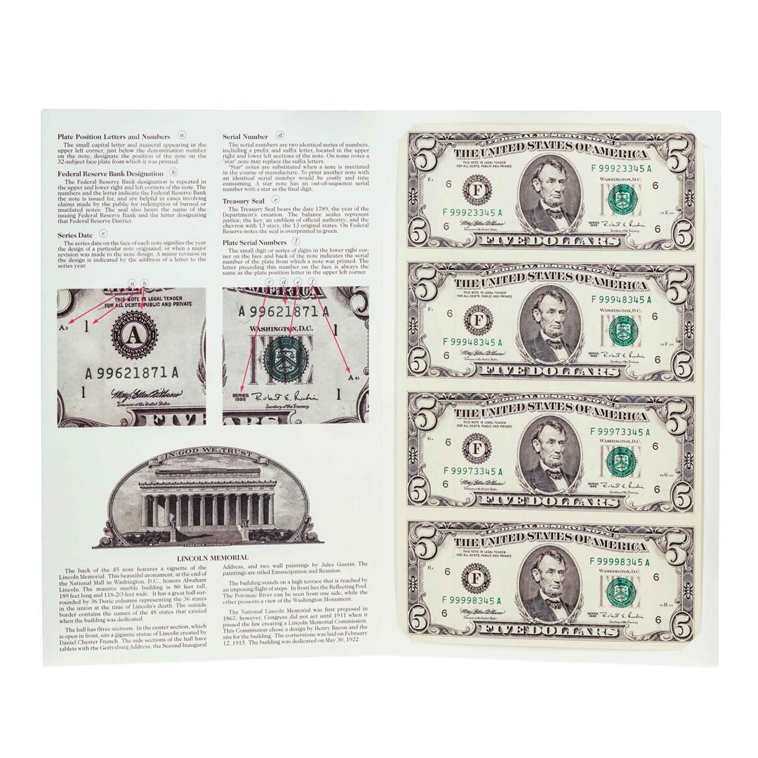 One Uncut Sheet of (4) 1995 $5 Federal Reserve Notes.