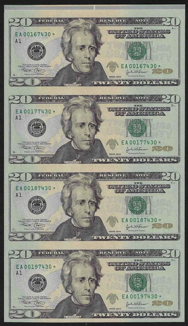 One Uncut Sheet of (4) 2004 $20 Federal Reserve STAR Notes.