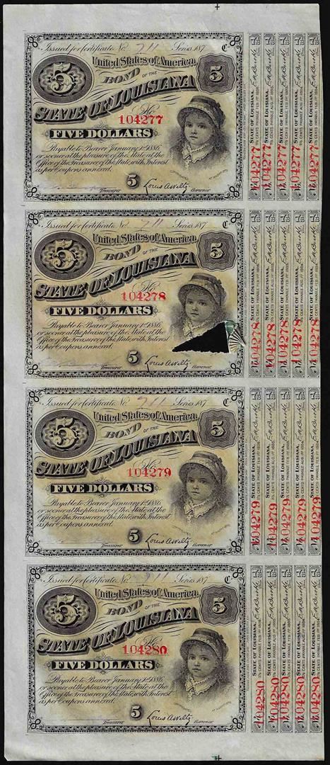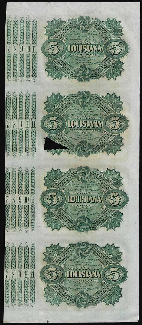 Uncut Sheet of (4) State of Louisiana Baby Bond Obsolete Notes - Internal Tear