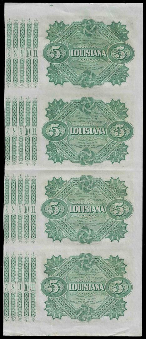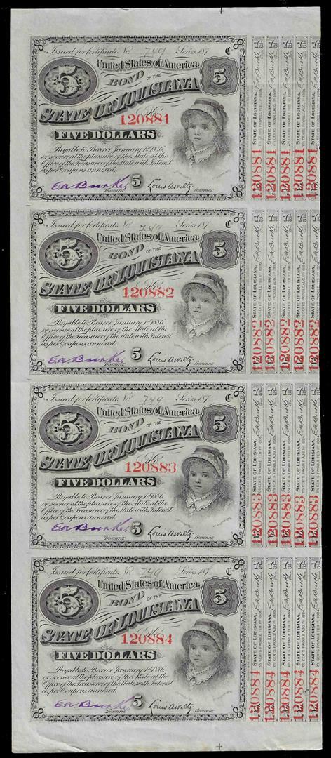 One Uncut Sheet of (4) State of Louisiana Baby Bond Obsolete Notes.