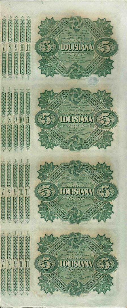One Uncut Sheet of (4) State of Louisiana Baby Bond Obsolete Notes.