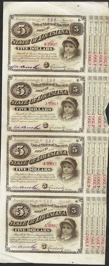 One Uncut Sheet of (4) State of Louisiana Baby Bond Obsolete Notes.