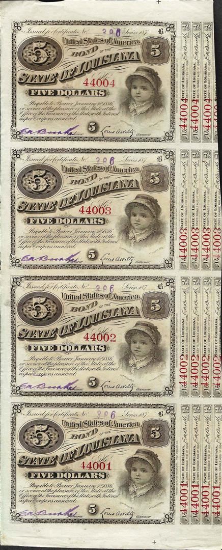 One Uncut Sheet of (4) State of Louisiana Baby Bond Obsolete Notes.