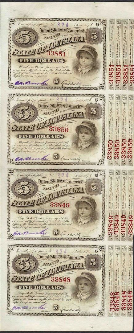 Uncut Sheet of (4) State of Louisiana Baby Bond Obsolete Notes
