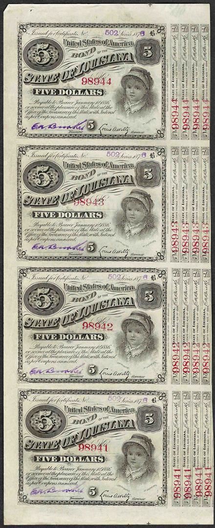 Uncut Sheet of (4) State of Louisiana Baby Bond Obsolete Notes
