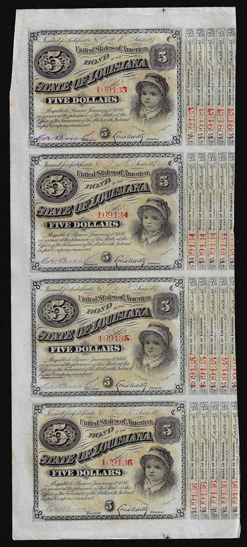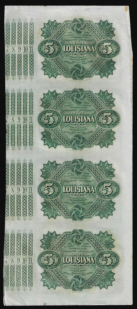 One Uncut Sheet of (4) State of Louisiana Baby Bond Obsolete Notes.