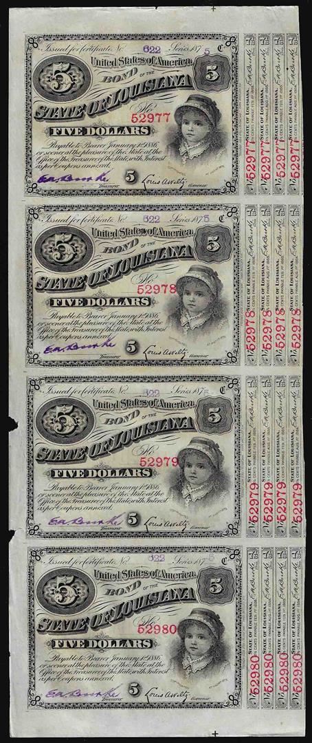One Uncut Sheet of (4) State of Louisiana Baby Bond Obsolete Notes.