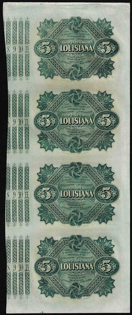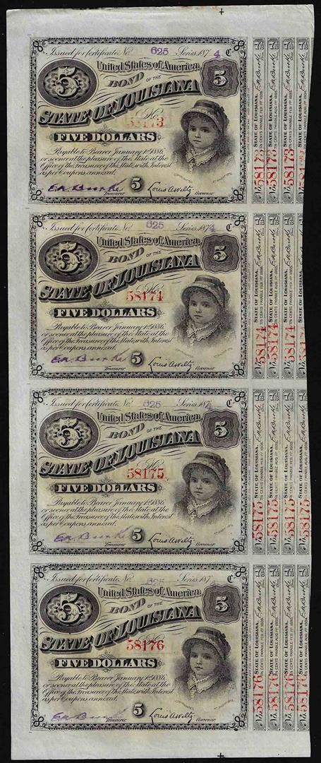 One Uncut Sheet of (4) State of Louisiana Baby Bond Obsolete Notes.