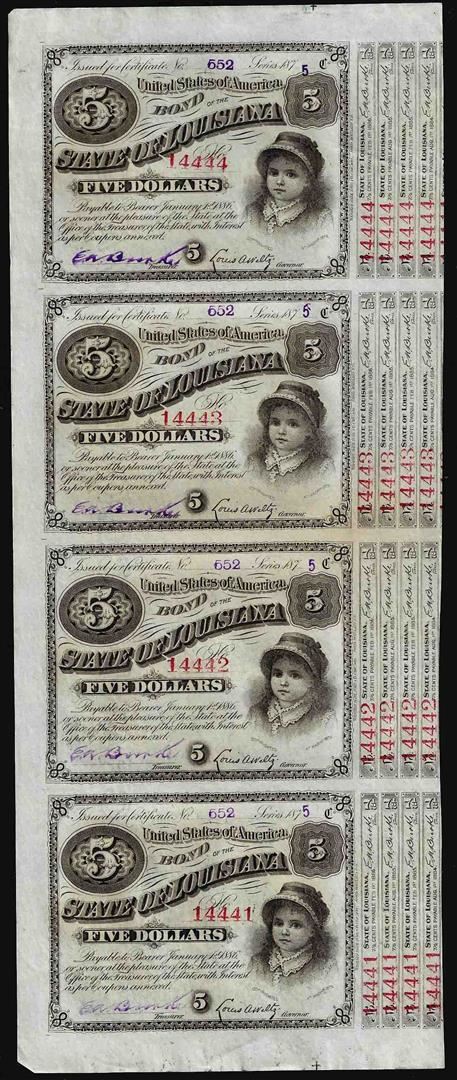 One Uncut Sheet of (4) State of Louisiana Baby Bond Obsolete Notes.