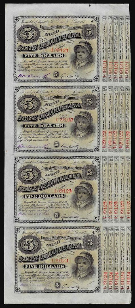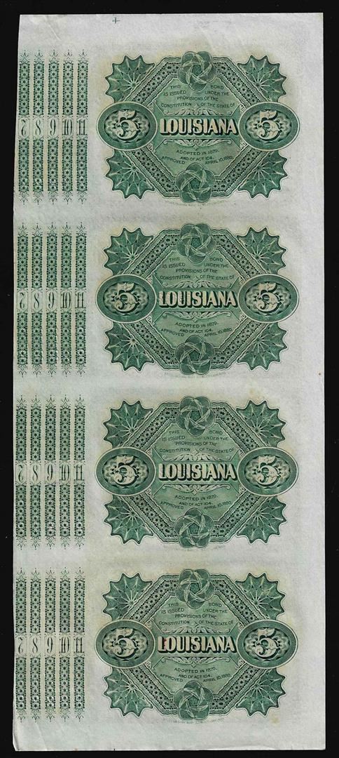 One Uncut Sheet of (4) State of Louisiana Baby Bond Obsolete Notes.