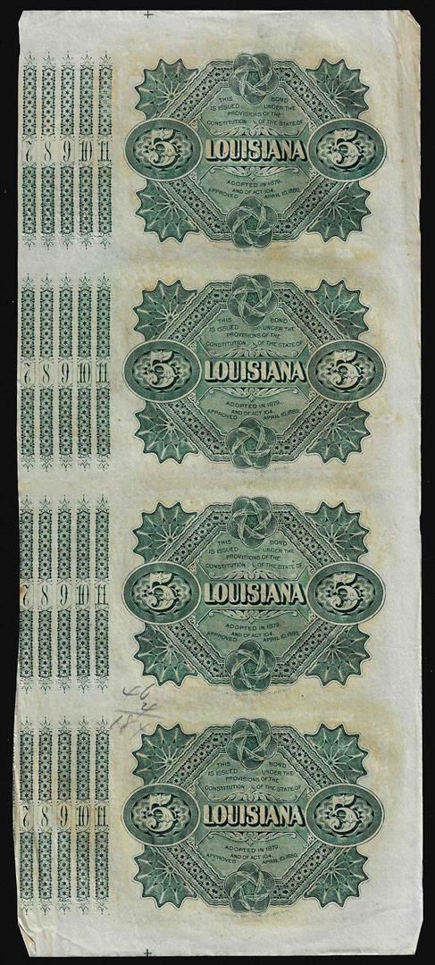 One Uncut Sheet of (4) State of Louisiana Baby Bond Obsolete Notes.