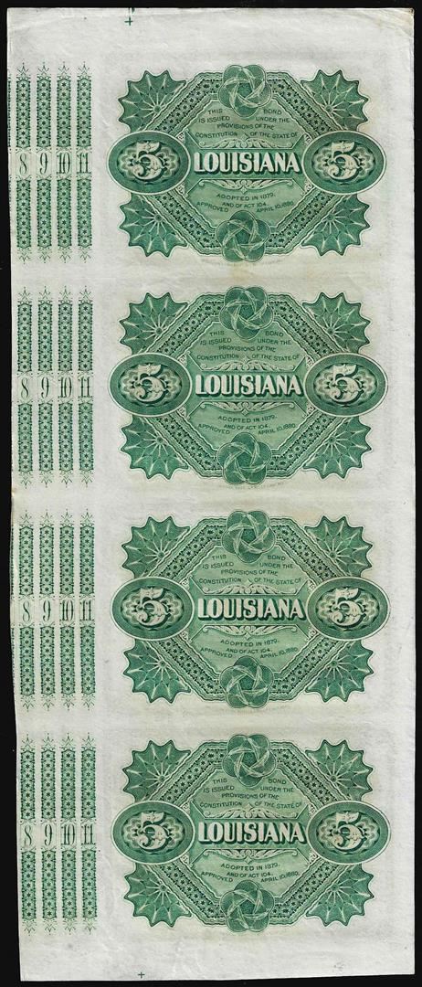 One Uncut Sheet of (4) State of Louisiana Baby Bond Obsolete Notes.