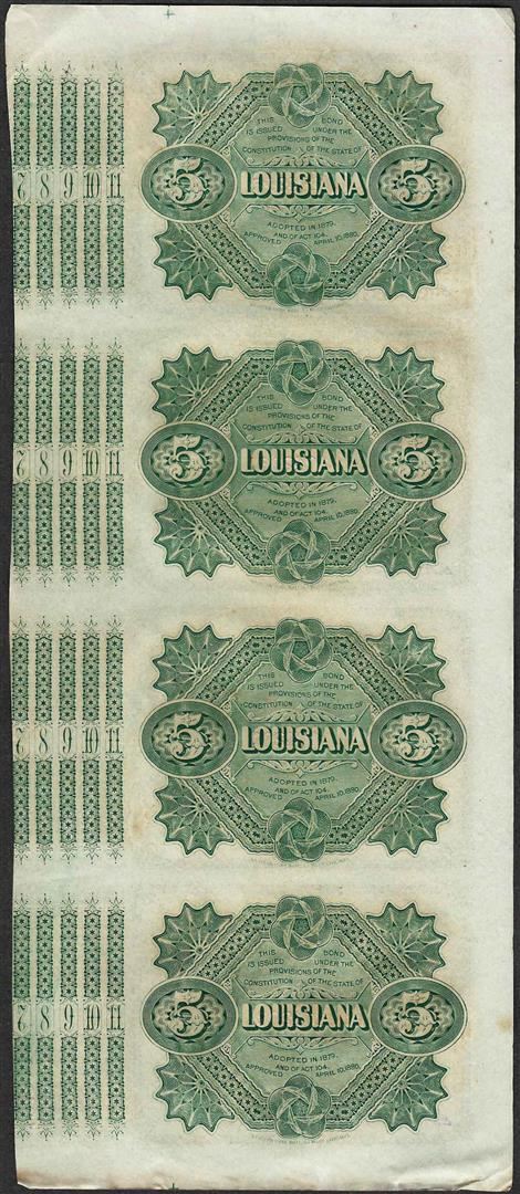 One Uncut Sheet of (4) State of Louisiana Baby Bond Obsolete Notes.
