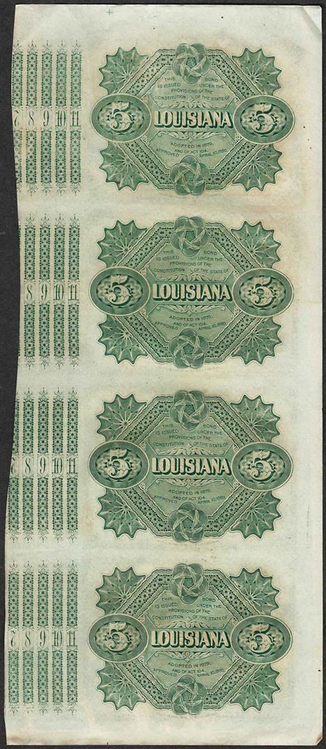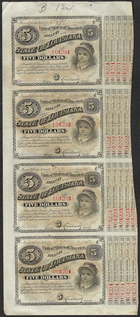 One Uncut Sheet of (4) State of Louisiana Baby Bond Obsolete Notes.