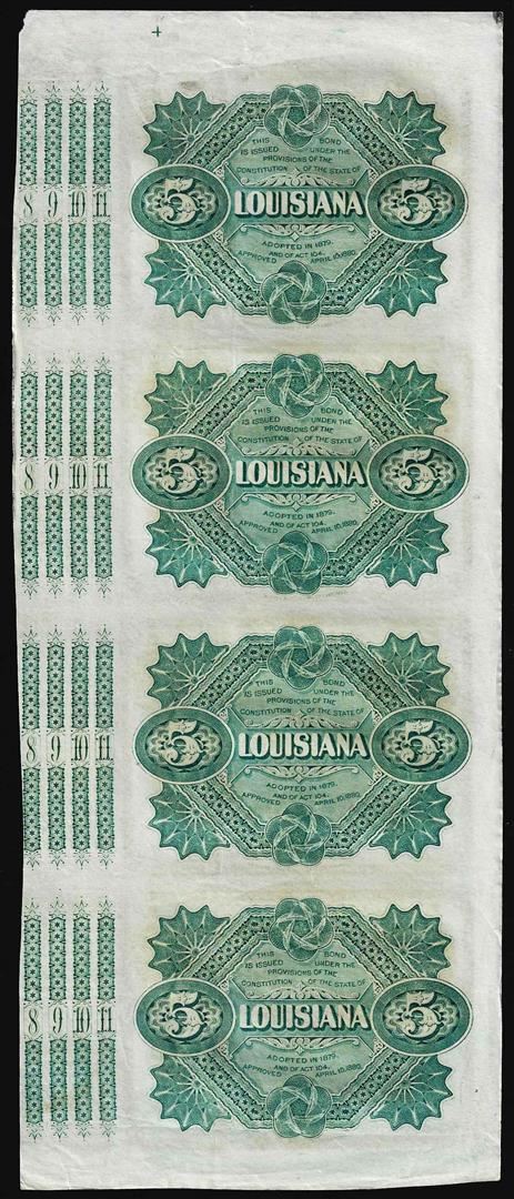 One Uncut Sheet of (4) State of Louisiana Baby Bond Obsolete Notes.