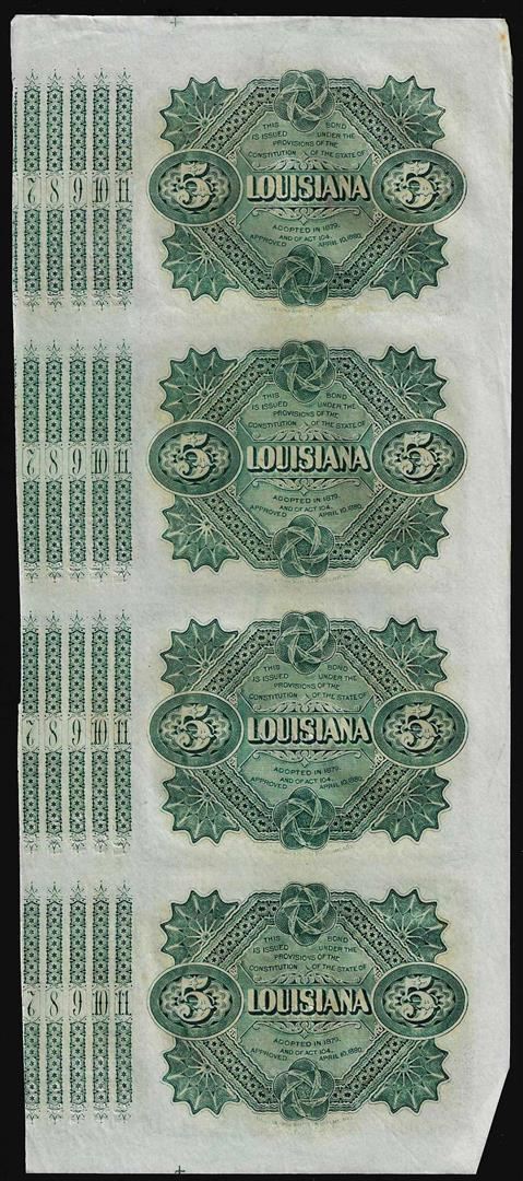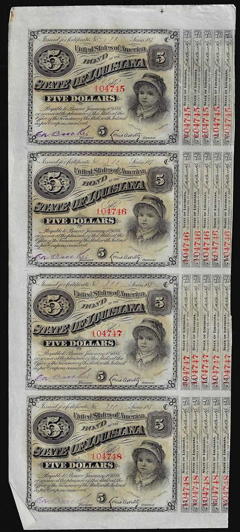 One Uncut Sheet of (4) State of Louisiana Baby Bond Obsolete Notes.