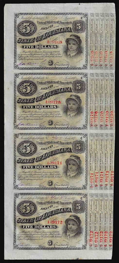 One Uncut Sheet of (4) State of Louisiana Baby Bond Obsolete Notes.