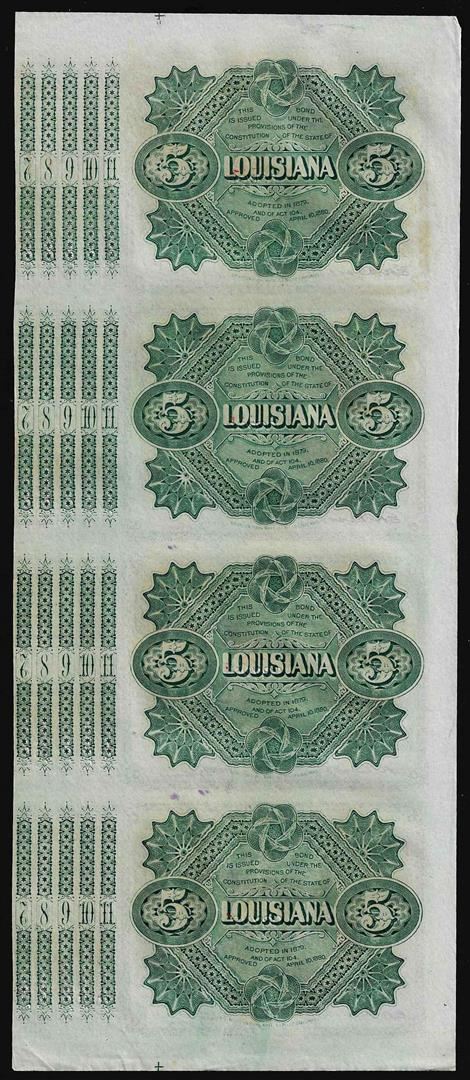 One Uncut Sheet of (4) State of Louisiana Baby Bond Obsolete Notes.