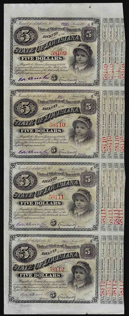 One Uncut Sheet of (4) State of Louisiana Baby Bond Obsolete Notes.