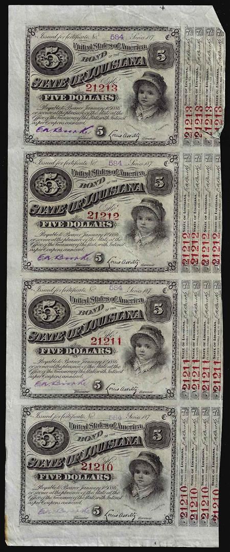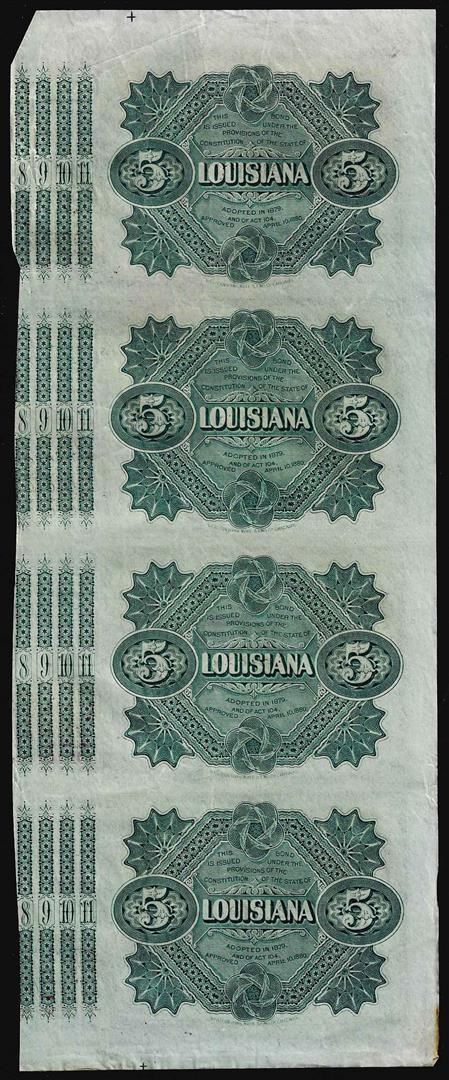 One Uncut Sheet of (4) State of Louisiana Baby Bond Obsolete Notes.
