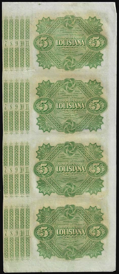One Uncut Sheet of (4) State of Louisiana Baby Bond Obsolete Notes.