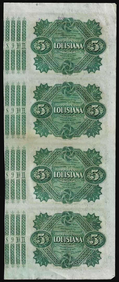 One Uncut Sheet of (4) State of Louisiana Baby Bond Obsolete Notes.
