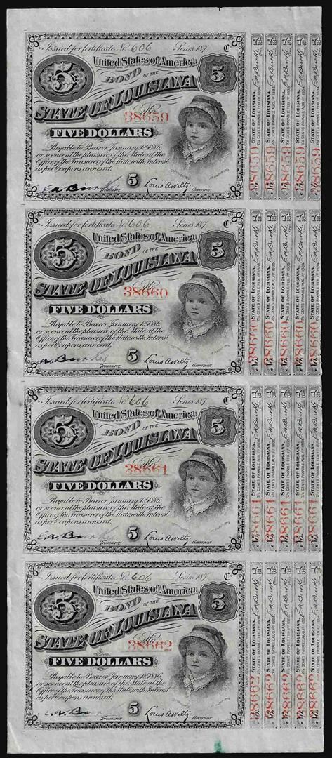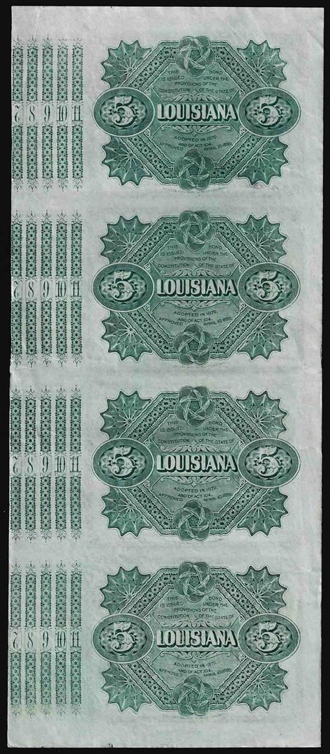 Uncut Sheet of (4) State of Louisiana Baby Bond Obsolete Notes