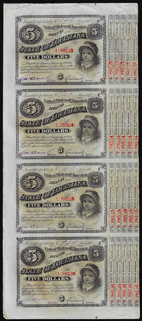 One Uncut Sheet of (4) State of Louisiana Baby Bond Obsolete Notes.