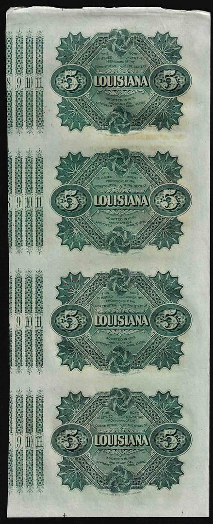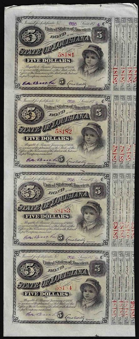 One Uncut Sheet of (4) State of Louisiana Baby Bond Obsolete Notes.