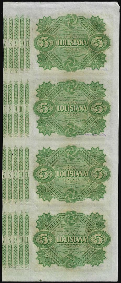One Uncut Sheet of (4) State of Louisiana Baby Bond Obsolete Notes.