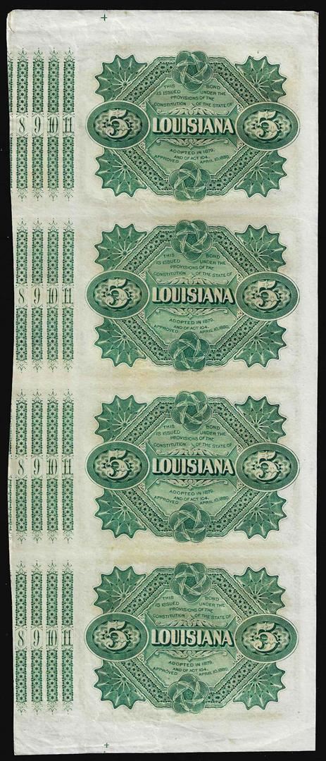 One Uncut Sheet of (4) State of Louisiana Baby Bond Obsolete Notes.