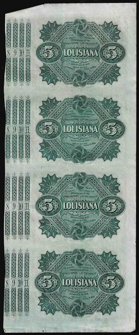 One Uncut Sheet of (4) State of Louisiana Baby Bond Obsolete Notes.