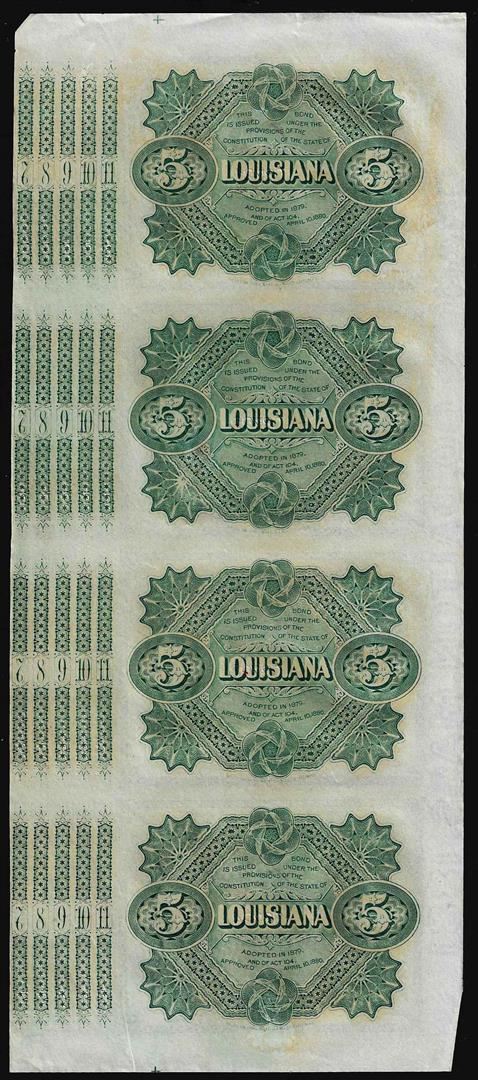 One Uncut Sheet of (4) State of Louisiana Baby Bond Obsolete Notes.
