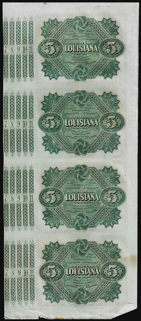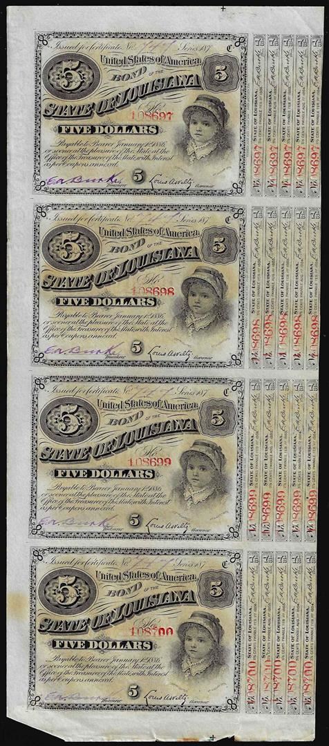 One Uncut Sheet of (4) State of Louisiana Baby Bond Obsolete Notes.