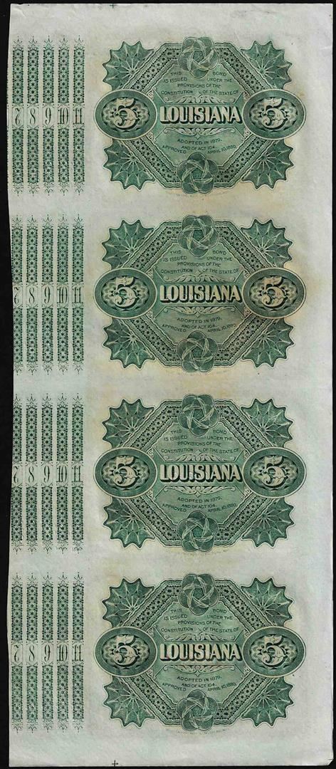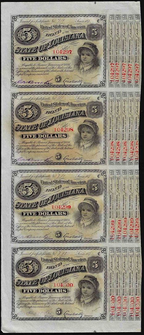 Uncut Sheet of (4) State of Louisiana Baby Bond Obsolete Notes