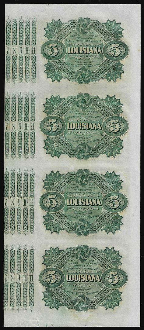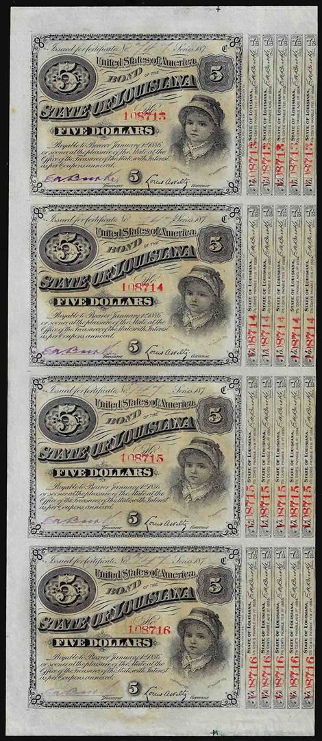 One Uncut Sheet of (4) State of Louisiana Baby Bond Obsolete Notes.